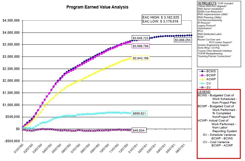 Using the Earned Value reporting, I was able to show the progress of each of the 14 Projects of the overall Program, and show exact details of progress and performance.